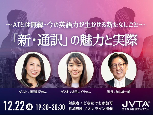 | 概要 | 主催:日本映像翻訳アカデミー 日程:2025年12月22日(月)19:30~20:30 参加費:無料 形式:オンライン(Zoom使用) 申込締切:2025年12月22日(月)18:30 詳細・申込:特設サイトよりお申込みください。 英語力を生かせる新たな仕事「新・通訳」について知ることができる無料のオンラインセミナー。翻訳者・バイリンガル通訳として活躍する修了生が登壇し、急増する「新・通訳」のニーズや仕事の具体例、AIとの関係、「新・通訳」で必要とされる英語力+αのスキルを解説する。また、2025年9月の「新・通訳ブートキャンプ」に参加した受講生も登場し、実体験を披露。さらに、次回の「新・通訳ブートキャンプ」についても紹介する。 |