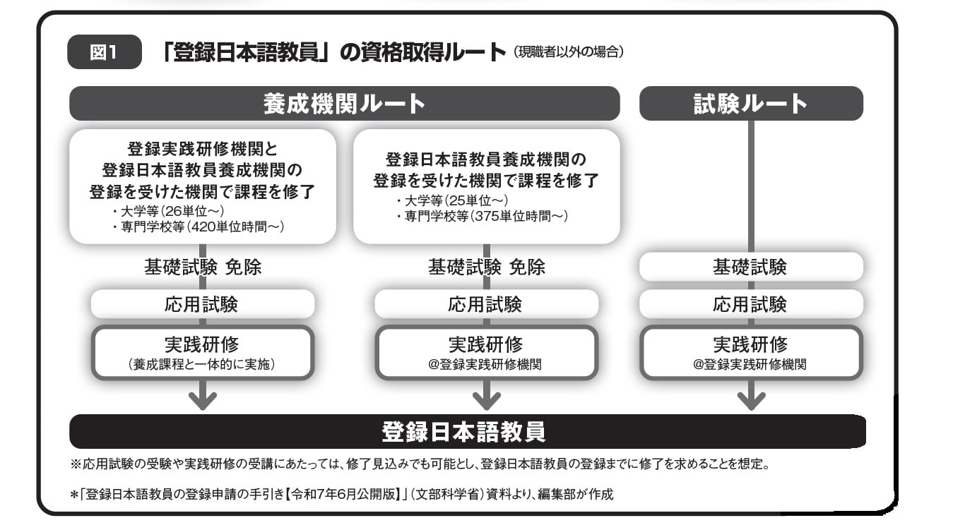 「認定日本語教育機関」の教員になるには「登録日本語教員」の資格が必要で(経過措置期間あり)、その取得には「日本語教員試験合格」と「実践研修修了」が求められる。